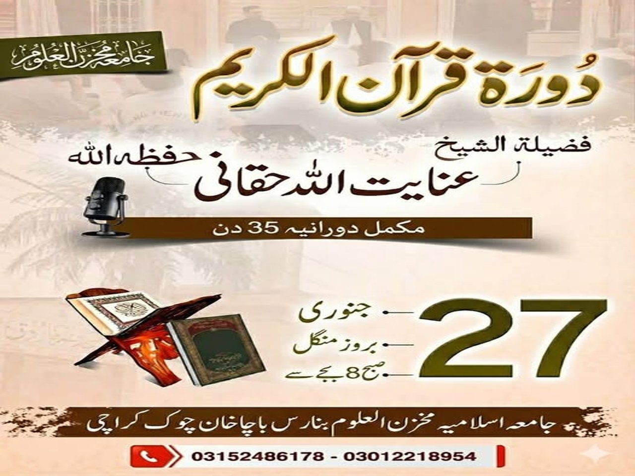 یہ دورہ ترجمہ و تفسیر قرآن الکریم ان شاءاللہ 35 دن پر مشتمل ہوگا، جس کے دوران ان شاءاللہ ترجمہ و تفسیر و مضامین قرآن کا جامع درس پیش کیا جائے گا۔ قرب و جوار کے دینی مدارس کے طلبہ، علماء، ائمہ مساجد، موذن حضرات اور کالجز و یونیورسٹیز کے طلبہ کیلئے بہترین موقع ہے کہ مختصر دورانیے کے اس کورس میں شامل ہوکر اللہ تعالیٰ کے کلام مبین کو سمجھنے کی اہلیت پیدا کریں۔ چھٹیوں کا بھی یہ انتہائی مثبت اور ثمربار مصرف ثابت ہوگا۔